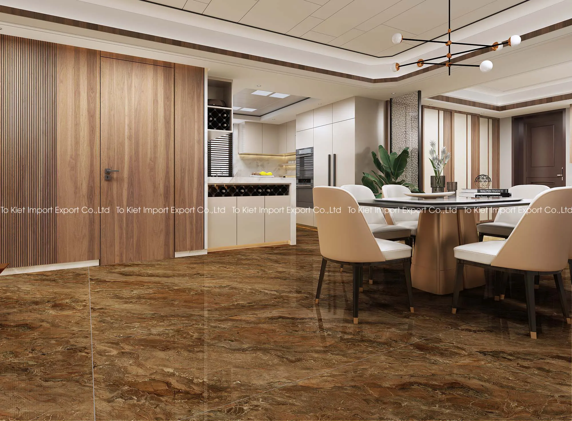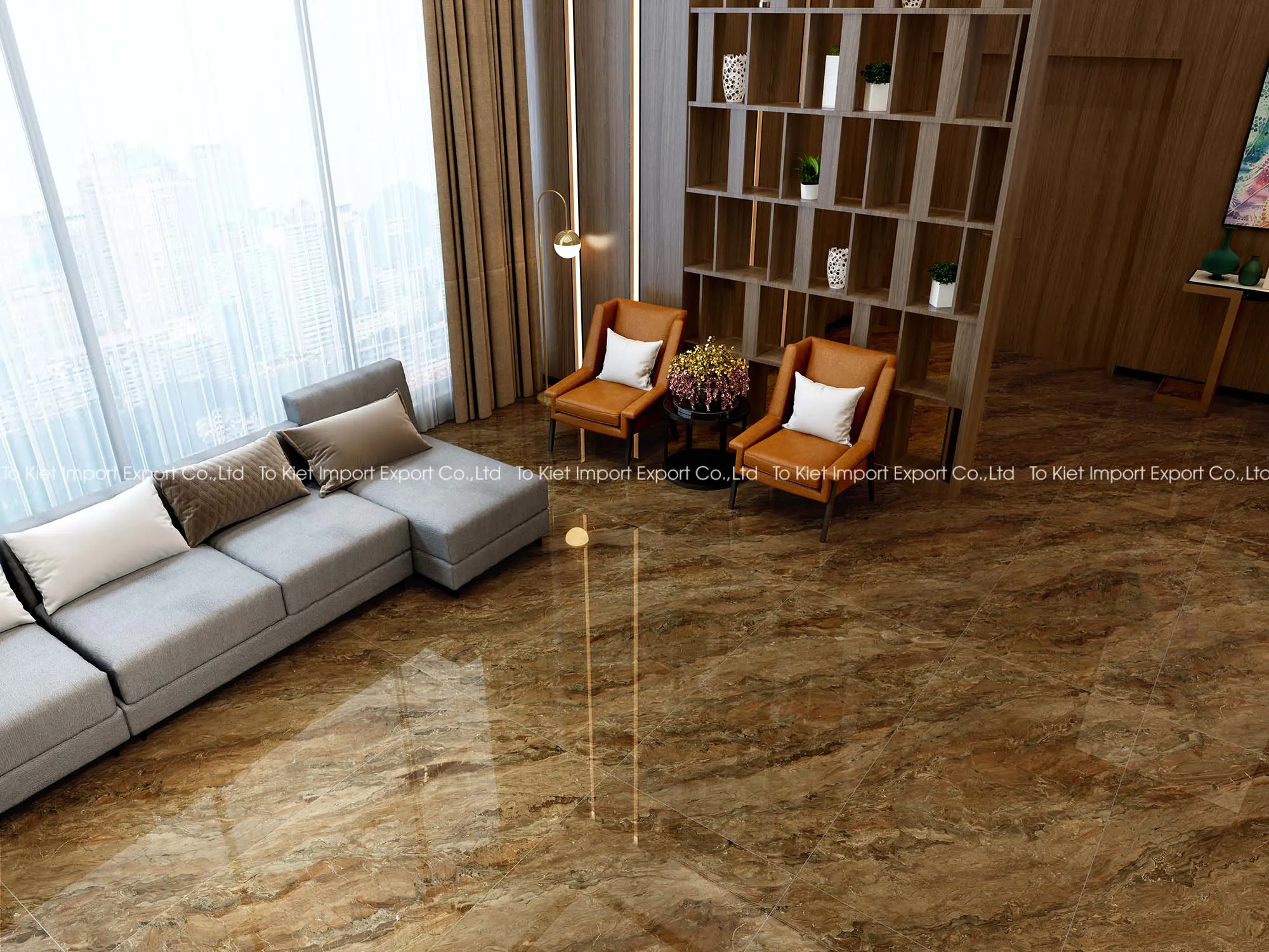 - Thuộc tính sáng bóng: Bề mặt gạch có độ bóng cao, giúp tăng cường ánh sáng và tạo hiệu ứng phản chiếu đẹp mắt.