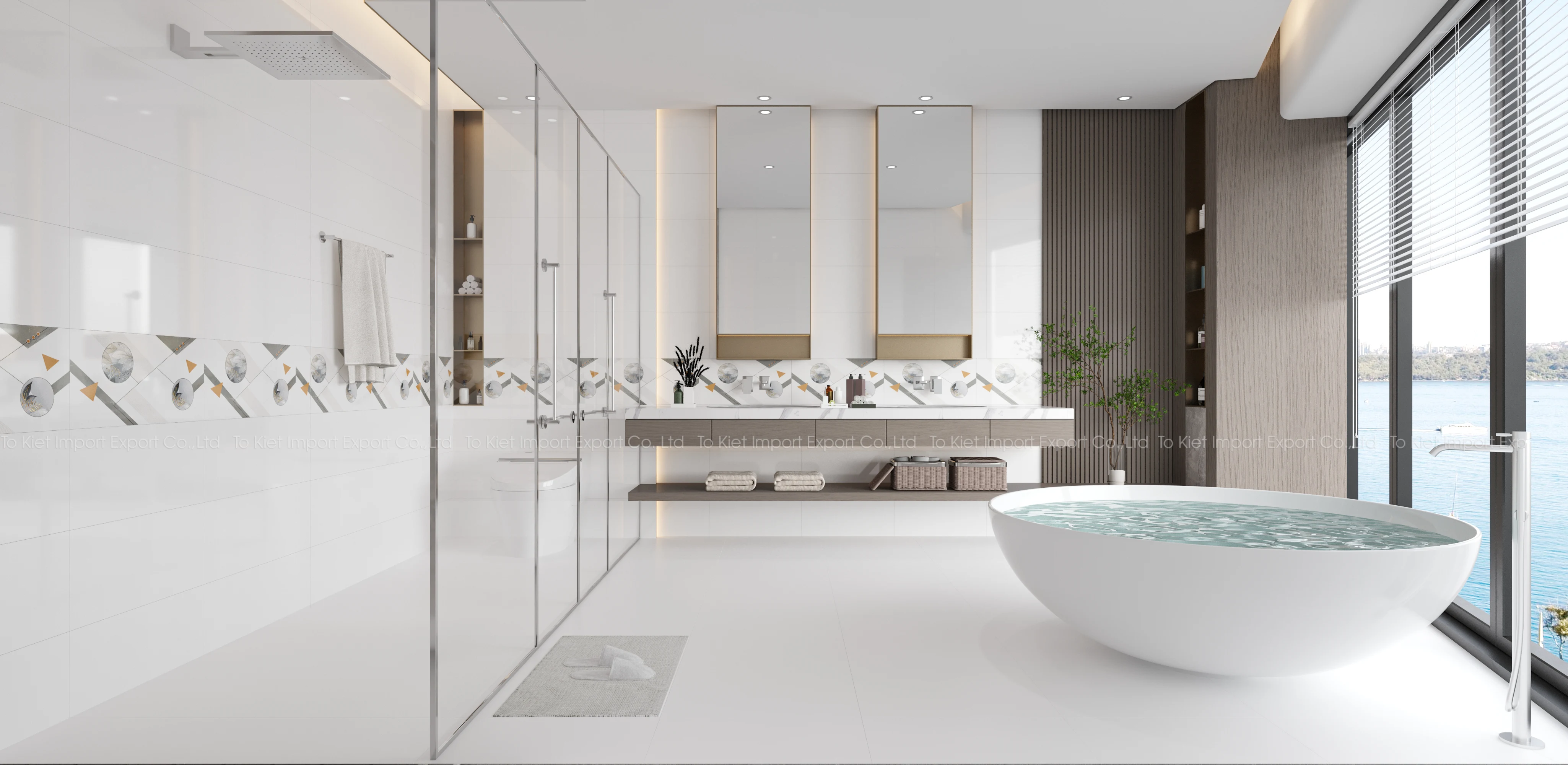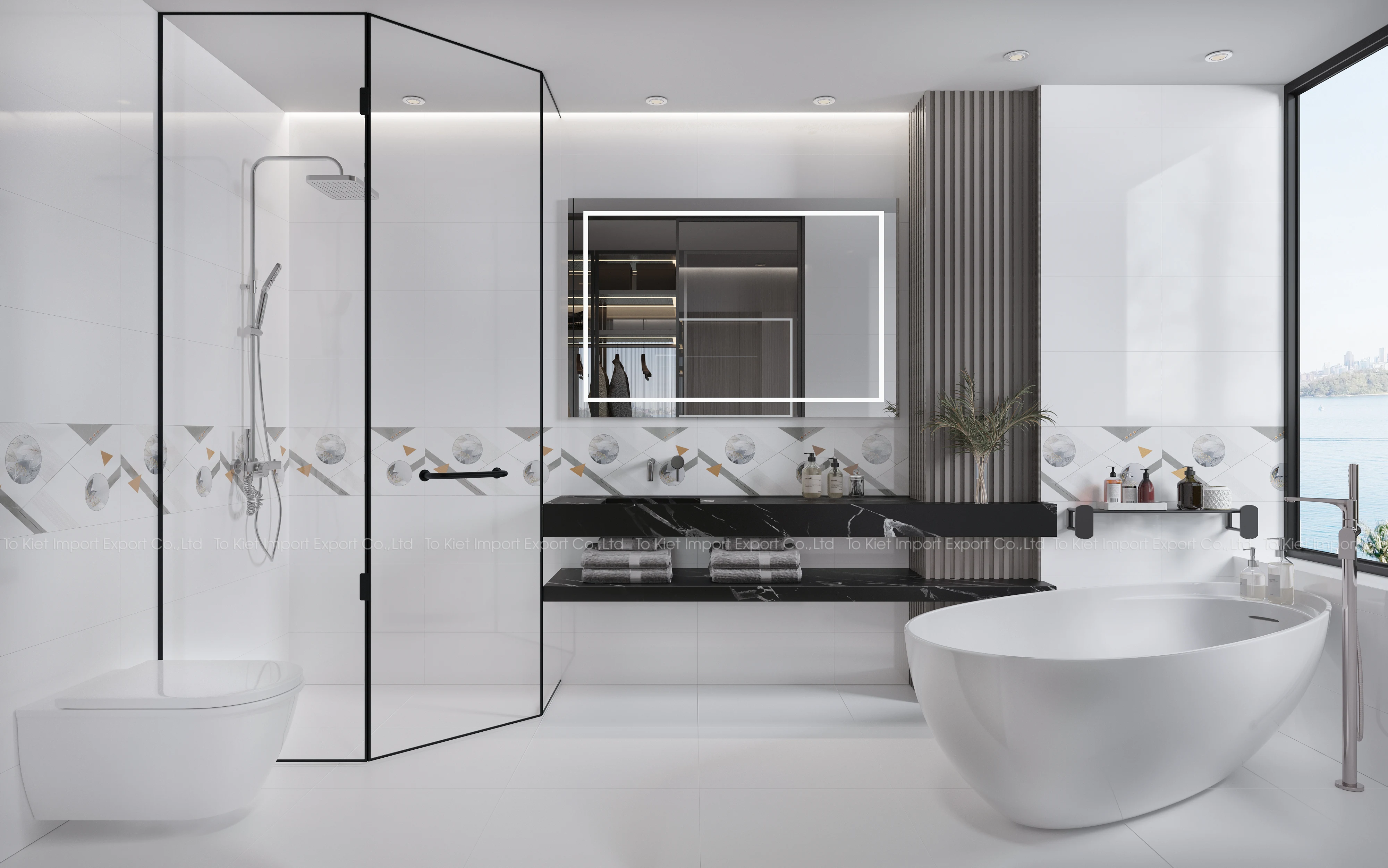 - Bố cục đồng bộ: Gạch nền – Gạch tường – Gạch điểm được thiết kế theo cùng phong cách.